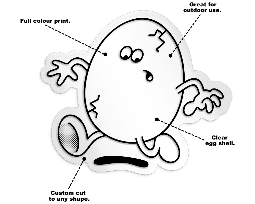 Tough, matte, and made to stay stuck. These white egg shell stickers are printed in full colour and cut to any shape you like.